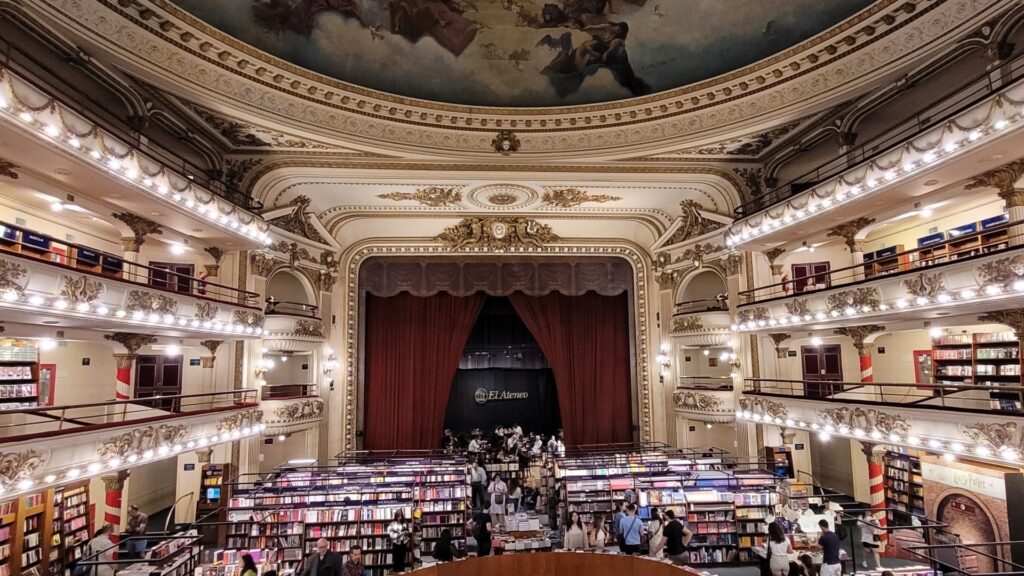 Buenos Aires, the museum-city, a splendor of a lost era, overloaded with visual cues. Like the Grand Splendid, a former theater transformed into a literary temple, floor after floor of books. You can’t absorb it all, and you no longer know where to look.